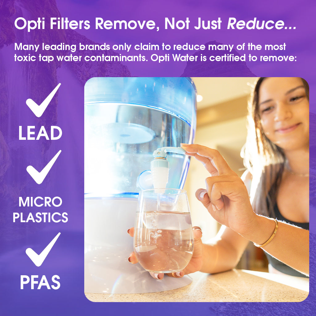 Each Opti Water™filter keeps you protected for 3–4 months (or 200 gallons) — twice as long as brands like Brita and PUR — while removing the most dangerous tap water toxins, including lead, microplastics, PFAs (forever chemicals), chlorine, mercury, copper, and other heavy metals.