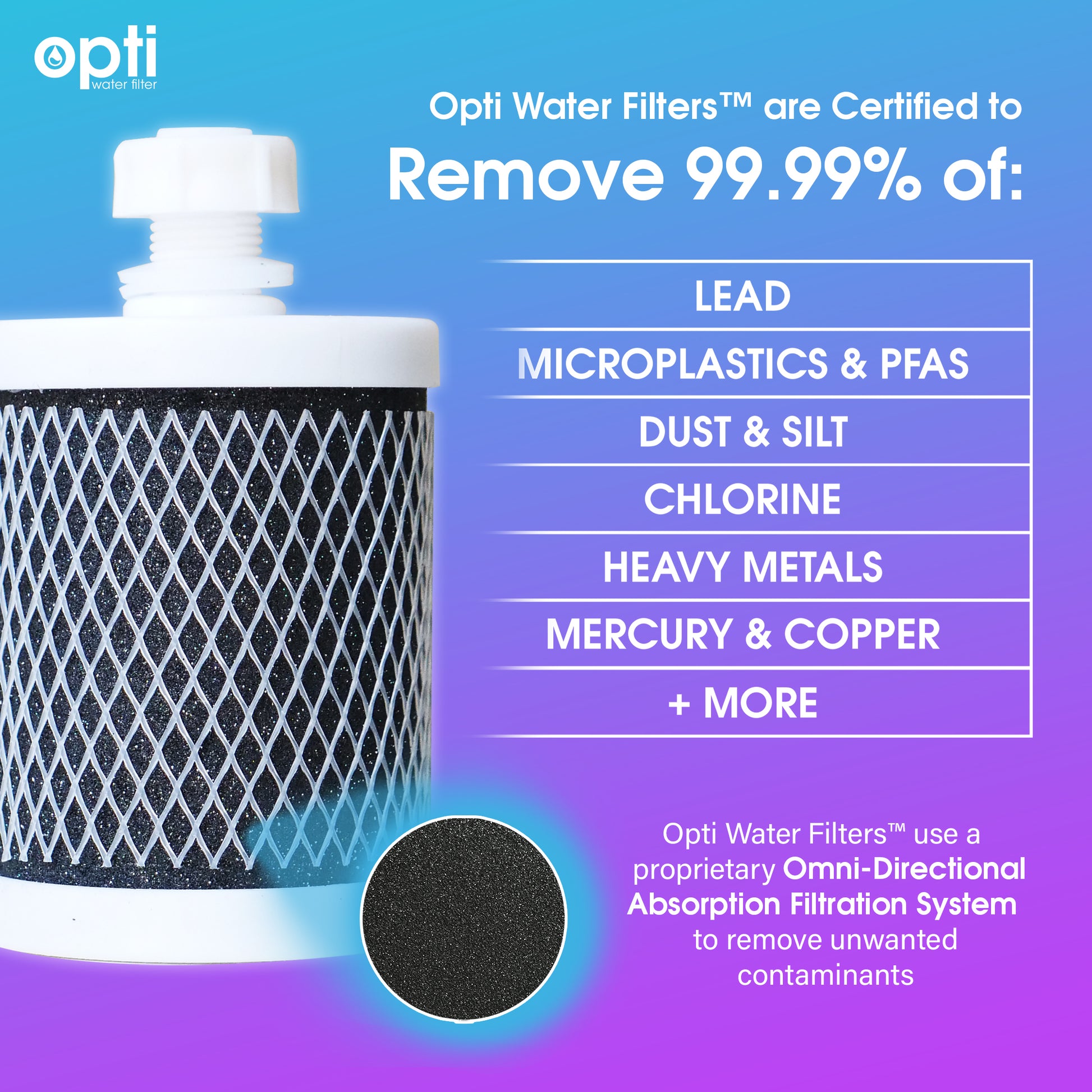 Opti Water™ Filters use premium solid coconut carbon and a proprietary blend of adsorption compounds to remove 99.99% of harmful contaminants, enhance alkalinity, and preserve essential minerals.